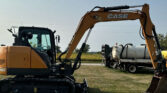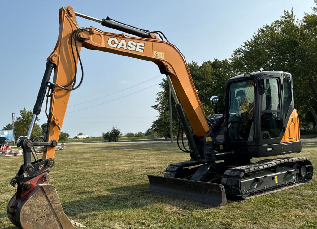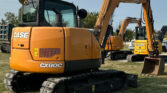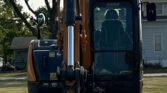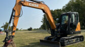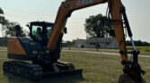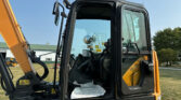 Clean, low-hour machine with reliable Isuzu diesel engine (43 kW). Equipped with OROPS cab, AC/heat, pattern changer, and two-speed hydrostatic travel. Features auxiliary hydraulics, backfill blade, and hydraulic quick coupler (Geith) with 29” Esco bucket. 5’7” stick, boom swing, and 18” rubber tracks.